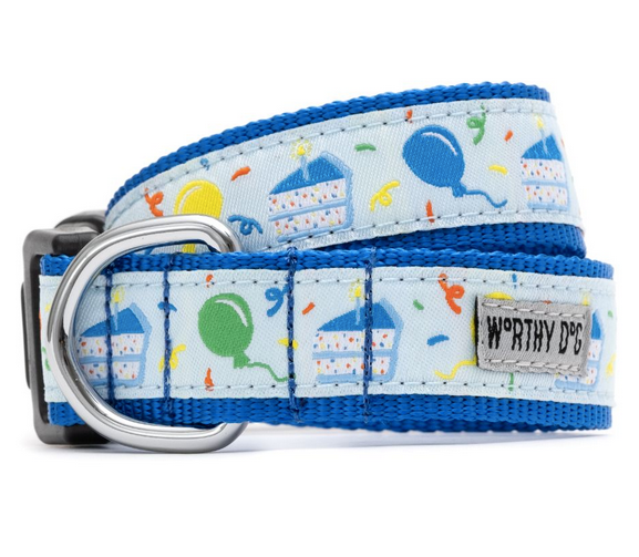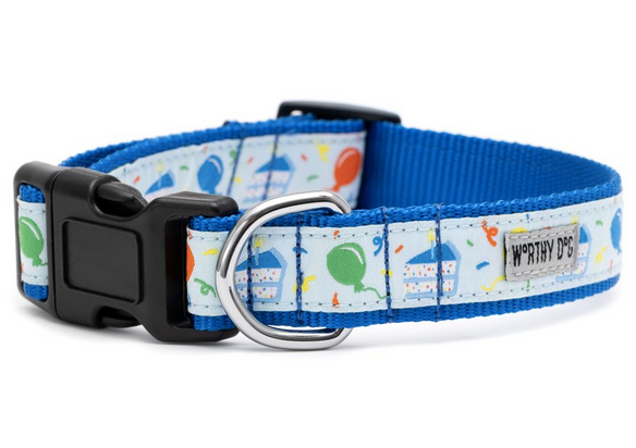 The Worthy Dog adjustable collar focuses on both durability and style, featuring woven ribbon sewn onto comfortable and durable nylon webbing with a snap clasp and nickel-plated D-ring
