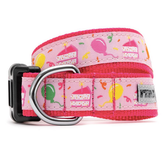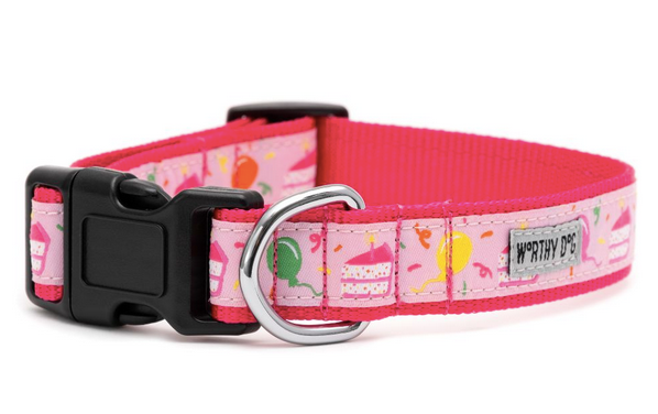 The Worthy Dog adjustable collar focuses on both durability and style, featuring woven ribbon sewn onto comfortable and durable nylon webbing with a snap clasp and nickel-plated D-ring