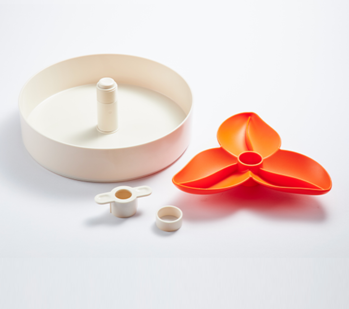 Each bowl has a multi-functional center puzzle element that can be adjusted in height to offer variation or flip it over to create a whole new option.