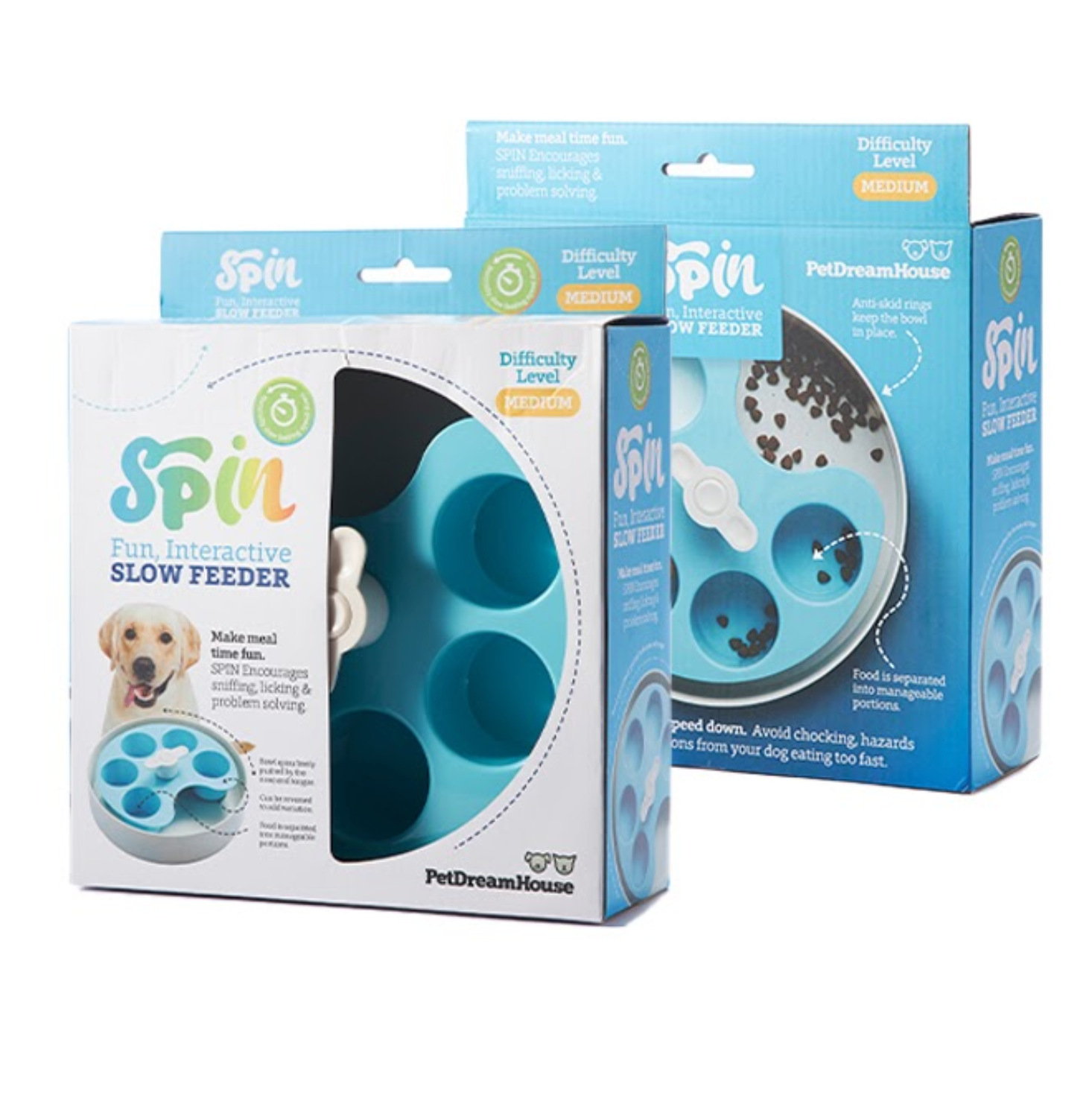 SPIN bowls encourage sniffing, licking, and problem-solving during meals, which naturally slow eating and prevent choking, bloating, and excessively fast eating.