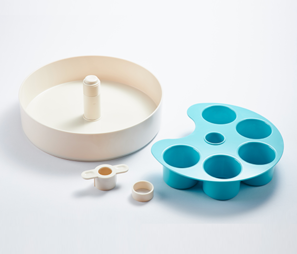 Each bowl has a multi-functional center puzzle element that can be adjusted in height to offer variation or flip it over to create a whole new option.