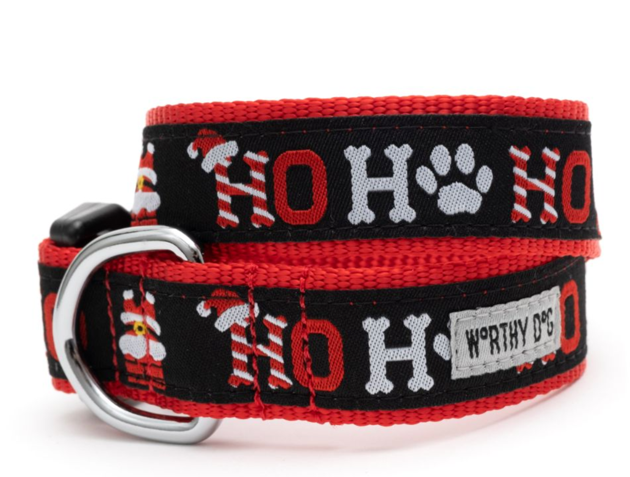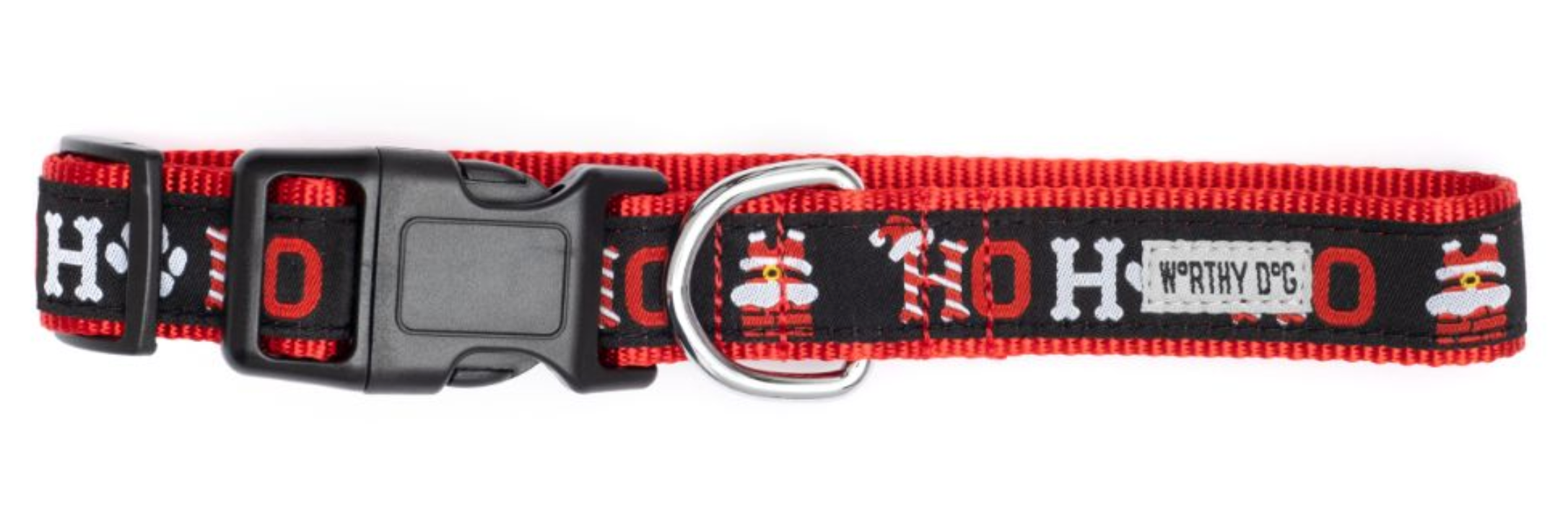 The Worthy Dog adjustable collar focuses on both durability and style, featuring woven ribbon sewn onto comfortable and durable nylon webbing with a snap clasp and nickel-plated D-ring