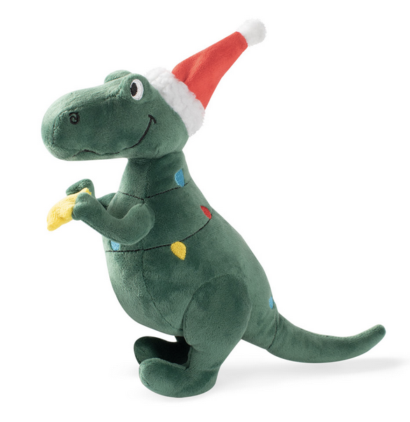 Holiday Tree Rex Plush Dog Toy is 11.5" X 10" & features an extra loud squeaker & crinkle Paper