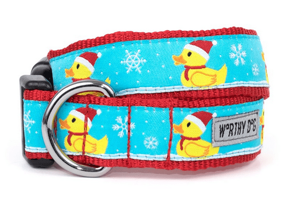 The Worthy Dog adjustable collar focuses on both durability and style, featuring woven ribbon sewn onto comfortable and durable nylon webbing with a snap clasp and nickel-plated D-ring