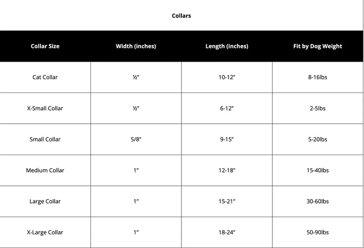SM: 5/8″ wide, 9-15″ length; MD: 1″ wide, 12-18″ length; LG: 1″ wide, 15-21″ length; XL: 1″ wide, 18-24″ length