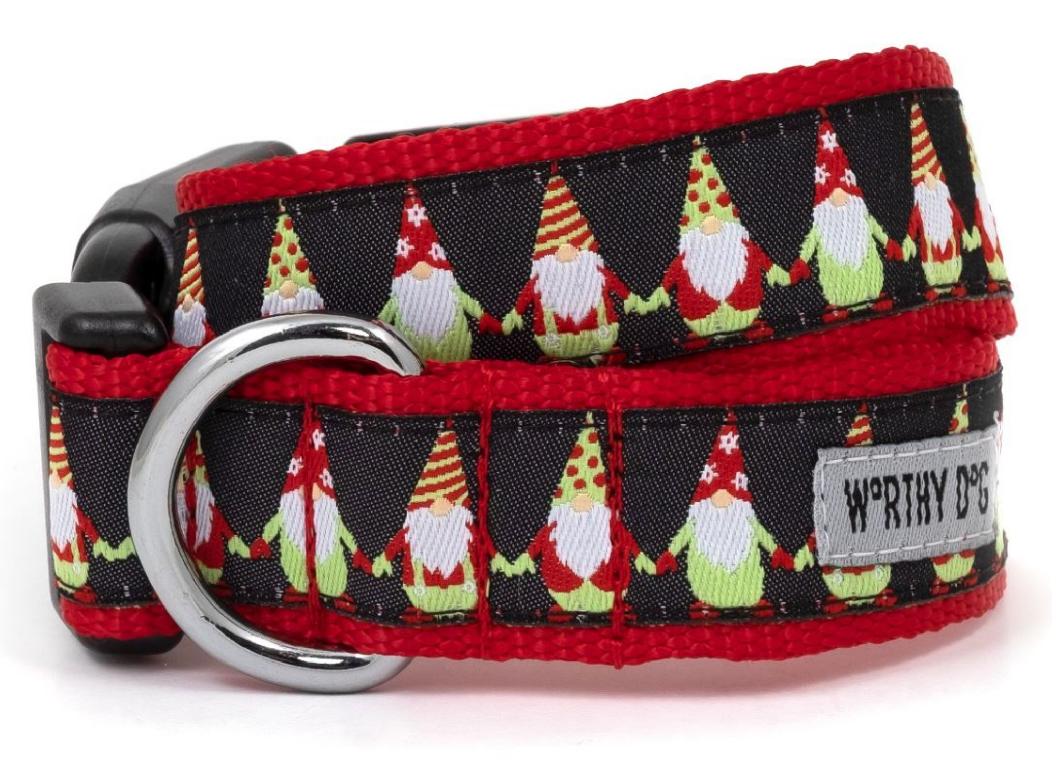 The Worthy Dog adjustable collar focuses on both durability and style, featuring woven ribbon sewn onto comfortable and durable nylon webbing with a snap clasp and nickel-plated D-ring