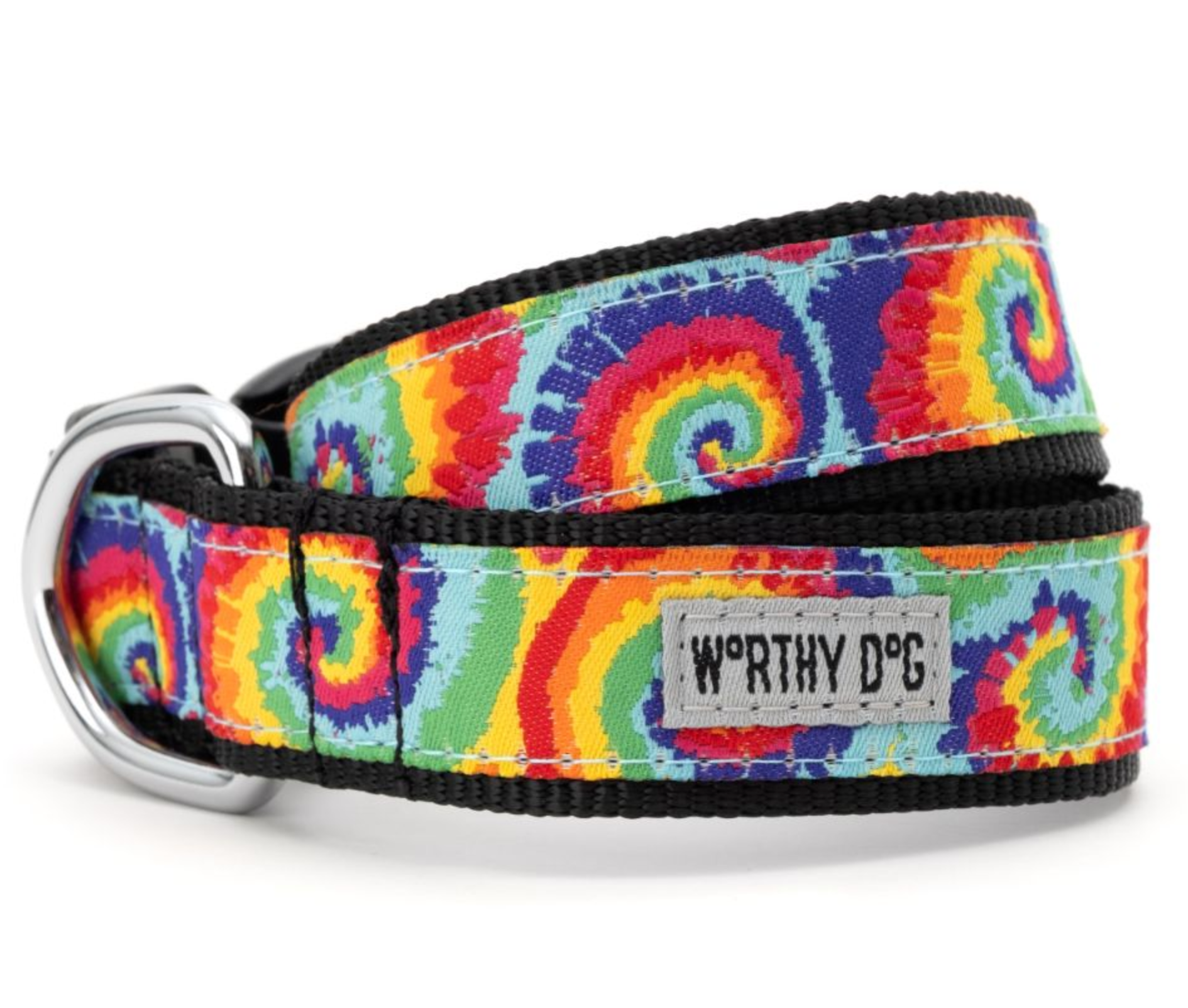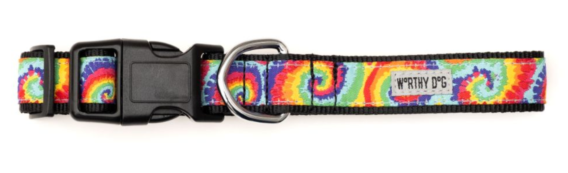 The Worthy Dog adjustable collar focuses on both durability and style, featuring woven ribbon sewn onto comfortable and durable nylon webbing with a snap clasp and nickel-plated D-ring