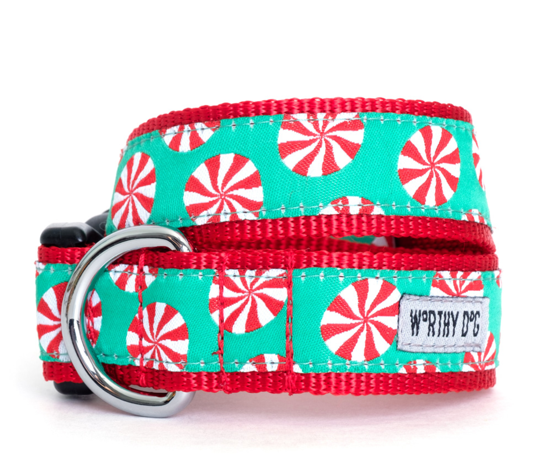 The Worthy Dog adjustable collar focuses on both durability and style, featuring woven ribbon sewn onto comfortable and durable nylon webbing with a snap clasp and nickel-plated D-ring