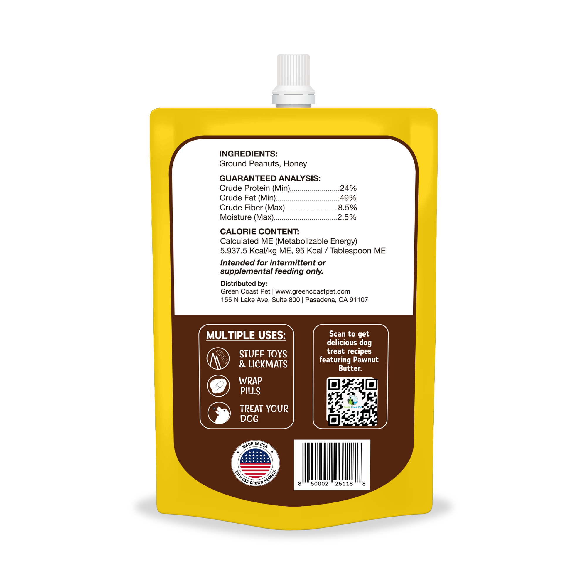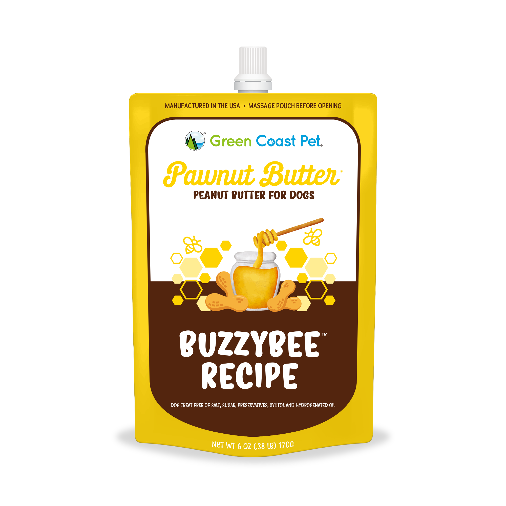 Green Coast Pet's famous Pawnut Butter with BuzzyBee is now available in a convenient 6 oz, resealable pouch for easy toy filling.