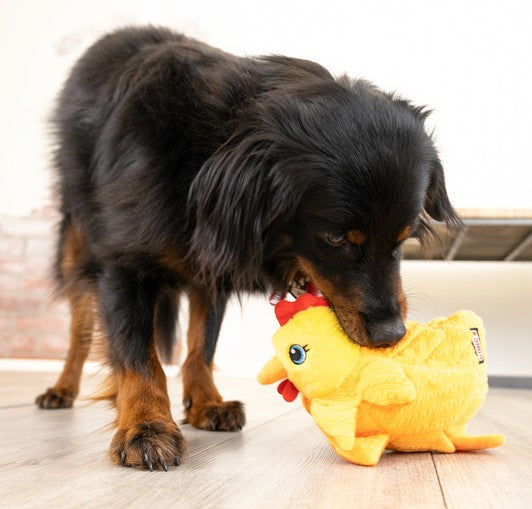 Crackle material and squeakers add excitement as dogs sniff, snack, play, and shake.