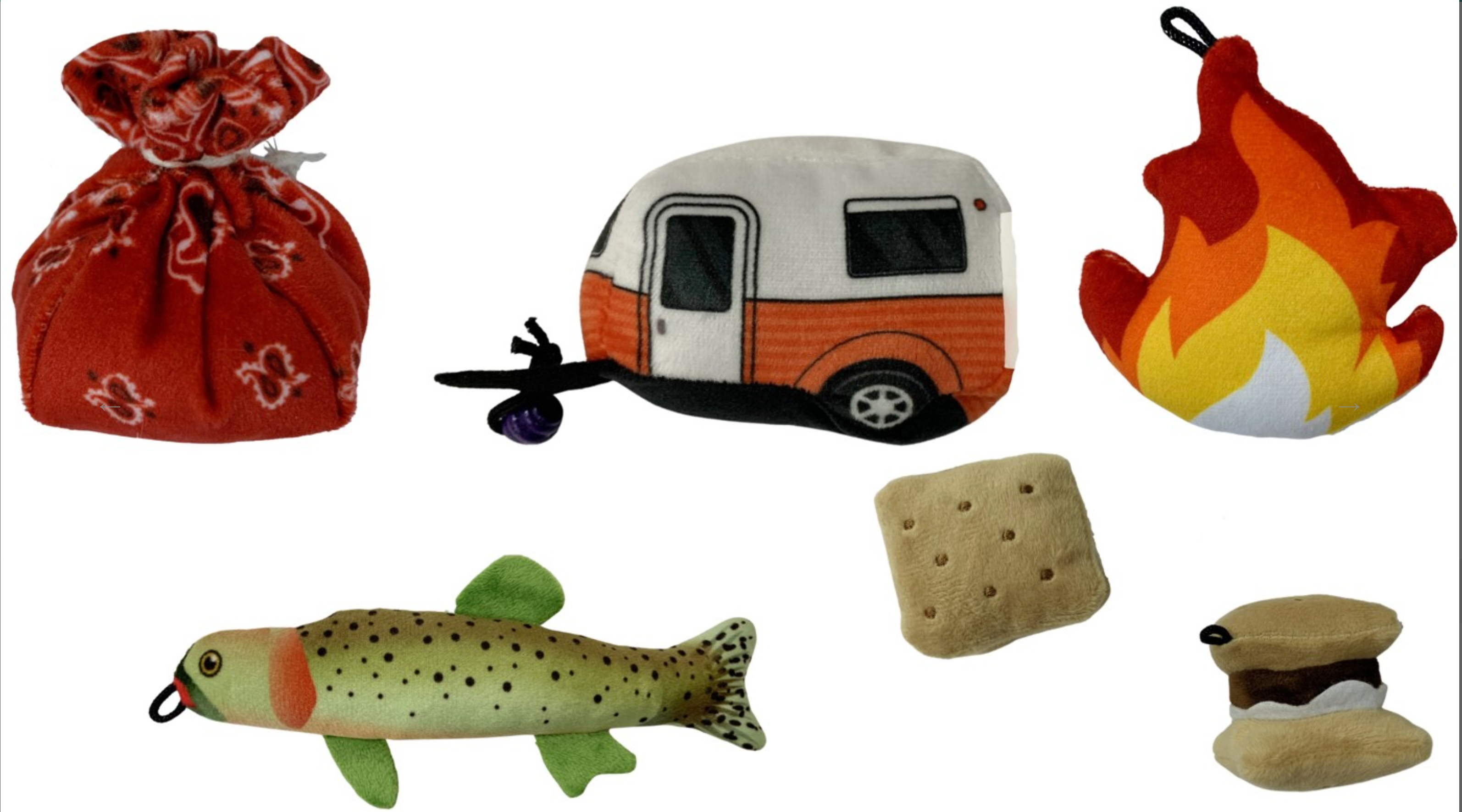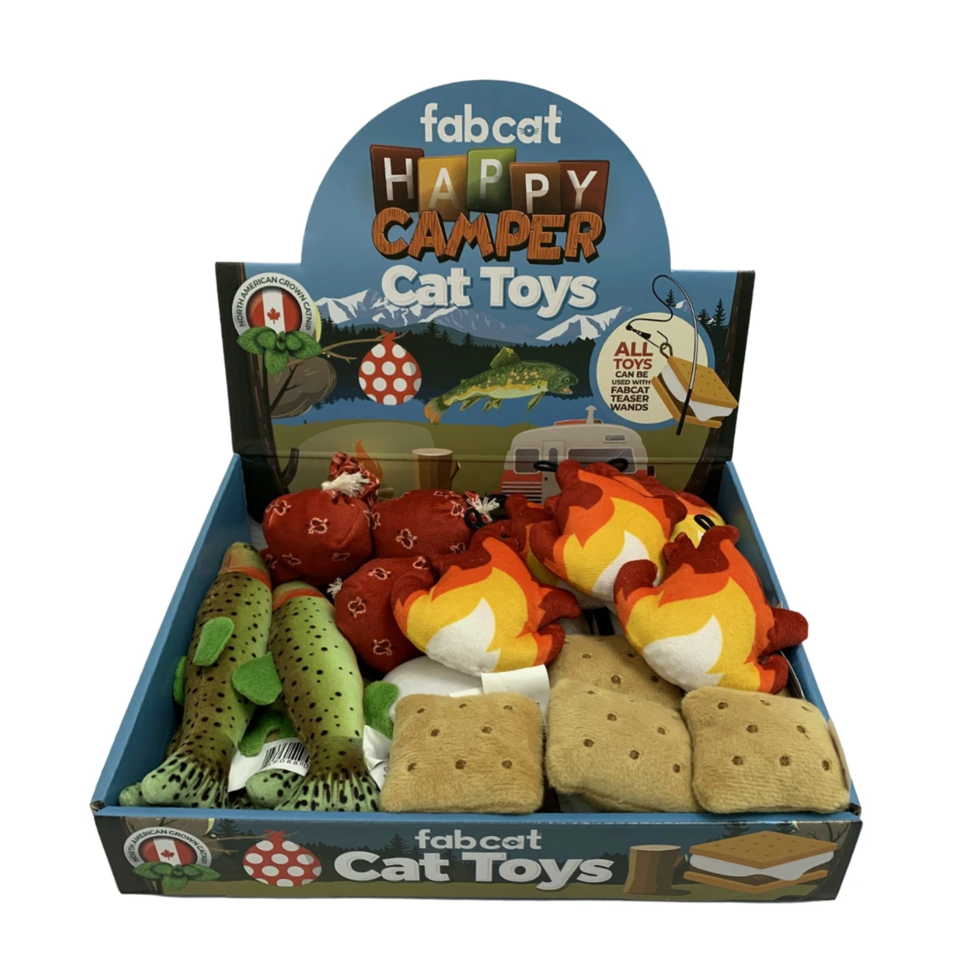 Happy Camper Cat toys are available in 5 options (fire, fish, hobo sack, s'mores & camper) with catnip locally grown in North America.