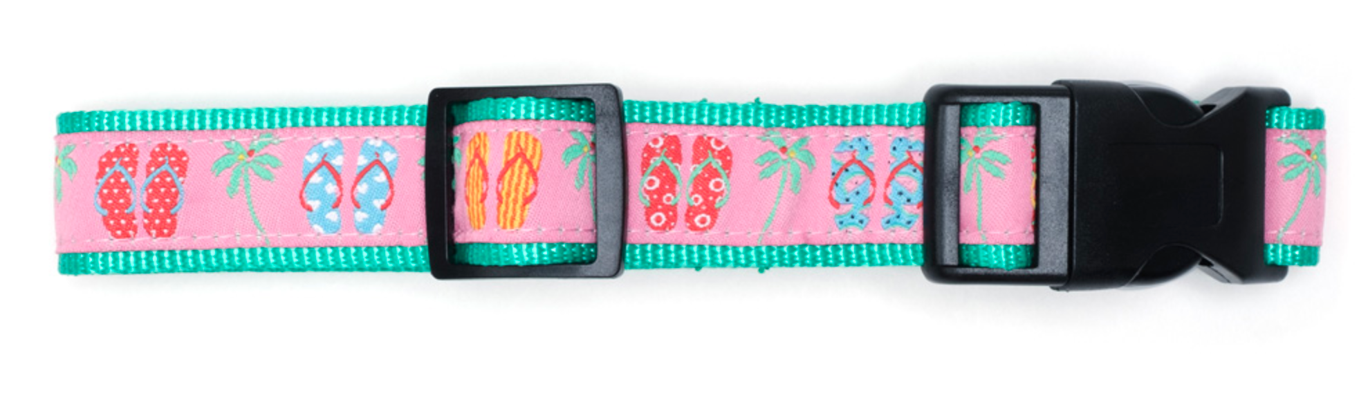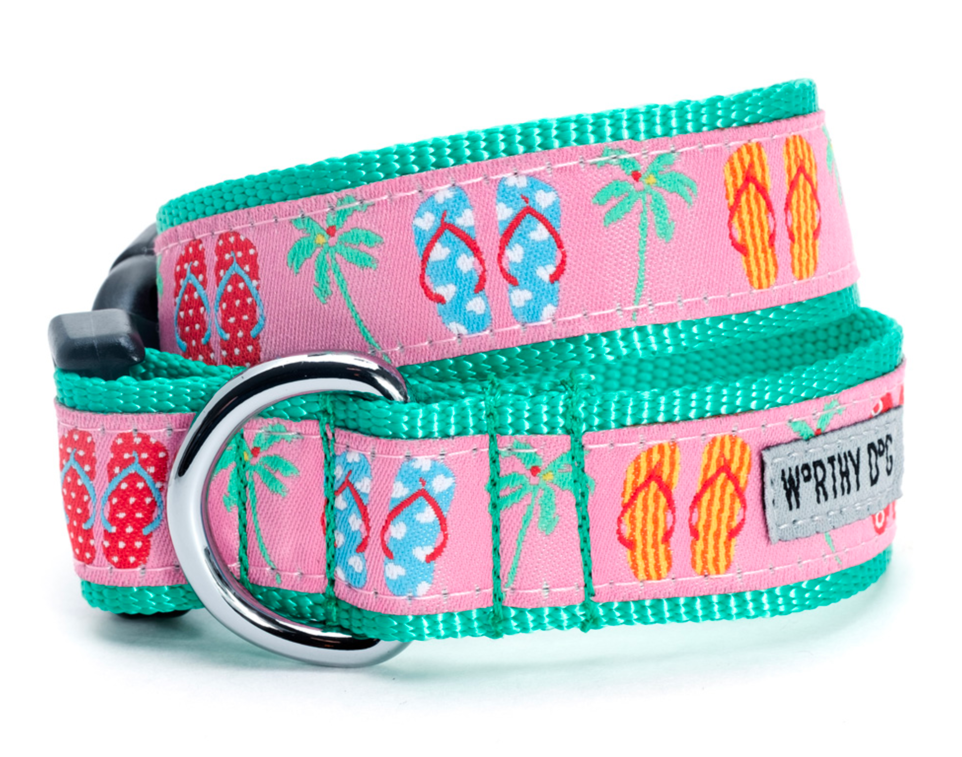 The Worthy Dog adjustable collar focuses on both durability and style, featuring woven ribbon sewn onto comfortable and durable nylon webbing with a snap clasp and nickel-plated D-ring