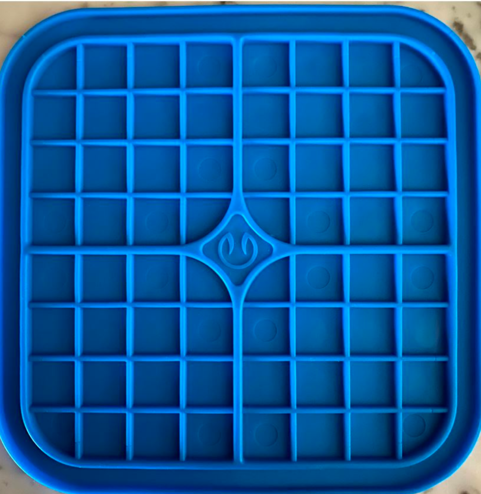 The squares on the mat can be filled with soft treats, wet food and even a combo including kibble. It can be frozen to prolong activiity.