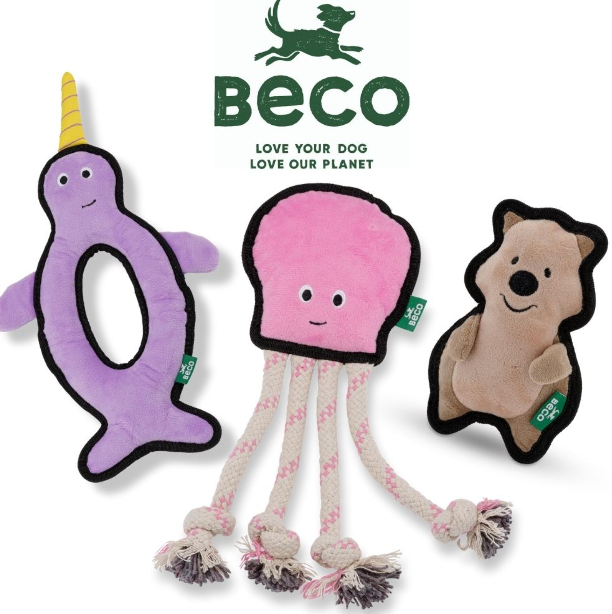 The adorable & tough toys are made from recycled plastic bottles and have interactive recyclable squeakers.