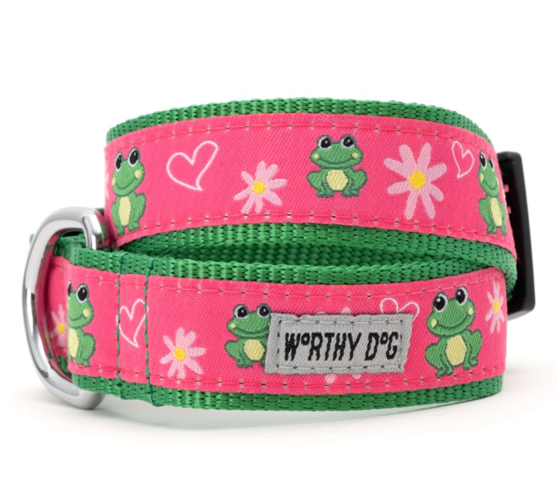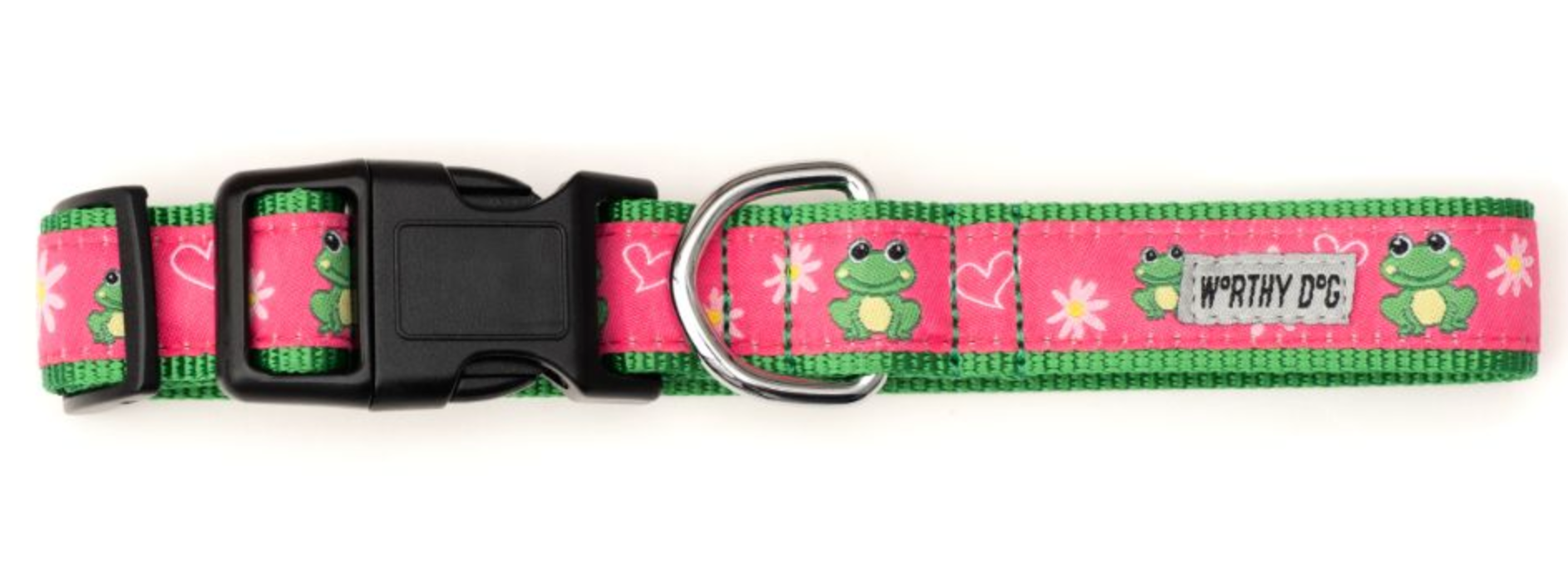 The Worthy Dog adjustable collar focuses on both durability and style, featuring woven ribbon sewn onto comfortable and durable nylon webbing with a snap clasp and nickel-plated D-ring