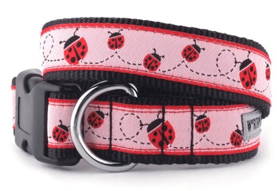 The Worthy Dog adjustable collar focuses on both durability and style, featuring woven ribbon sewn onto comfortable and durable nylon webbing with a snap clasp and nickel-plated D-ring