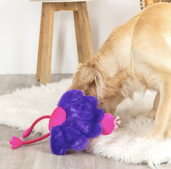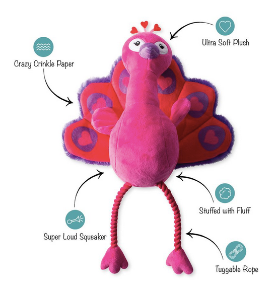 Made with a super loud squeaker, tuggable rope, and crazy crinkle paper details, this toy was designed with interactive play in mind.