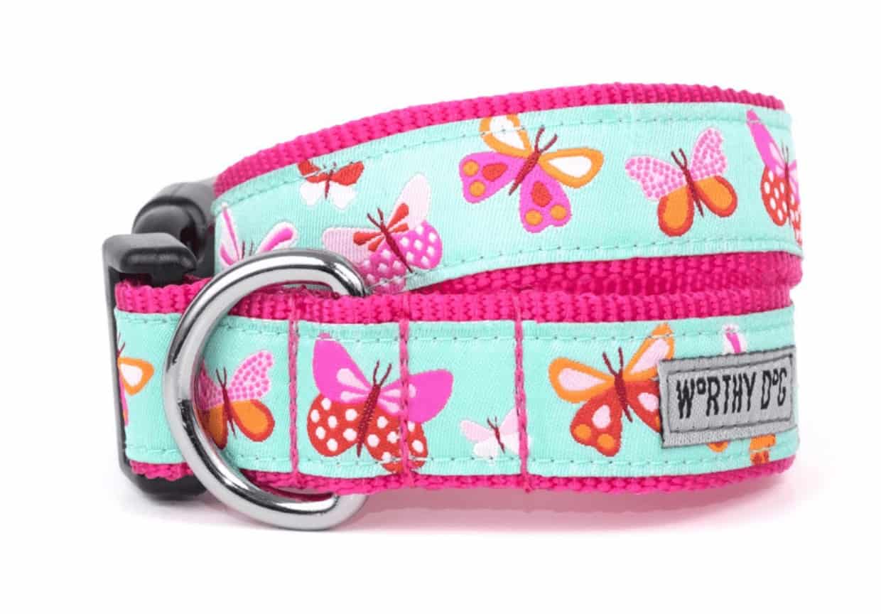 The Worthy Dog adjustable collar focuses on both durability and style, featuring woven ribbon sewn onto comfortable and durable nylon webbing with a snap clasp and nickel-plated D-ring