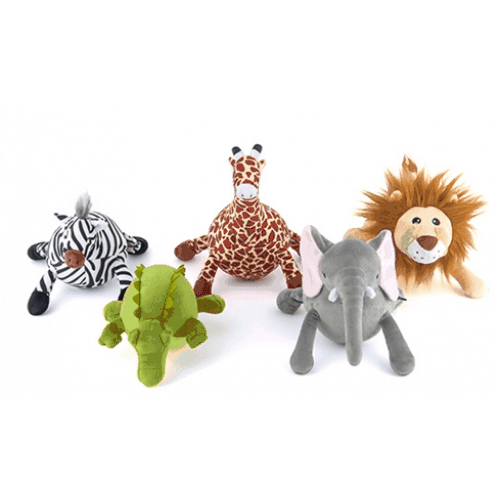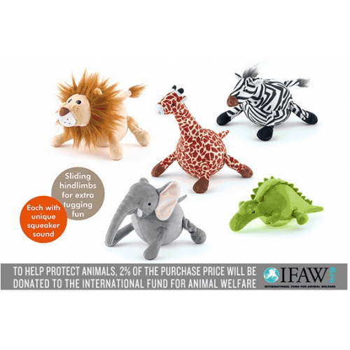 P.L.A.Y.’s Safari Toy Collection is fiercely cute with five lovably round wildlife creatures in the shape of a Zebra, Lion, Giraffe, Elephant and Crocodile. These cuddly companions are ideal for your furry king or queen of the jungle and will keep your dog active as they squeak, fall and tumble across the floor!Each toy features a unique sounding supersized squeaker inside to capture your pup's attention, sliding hind limbs for extra tugging fun and P.L.A.Y.’s certified safe eco-friendly PlanetFill® polyfiber.