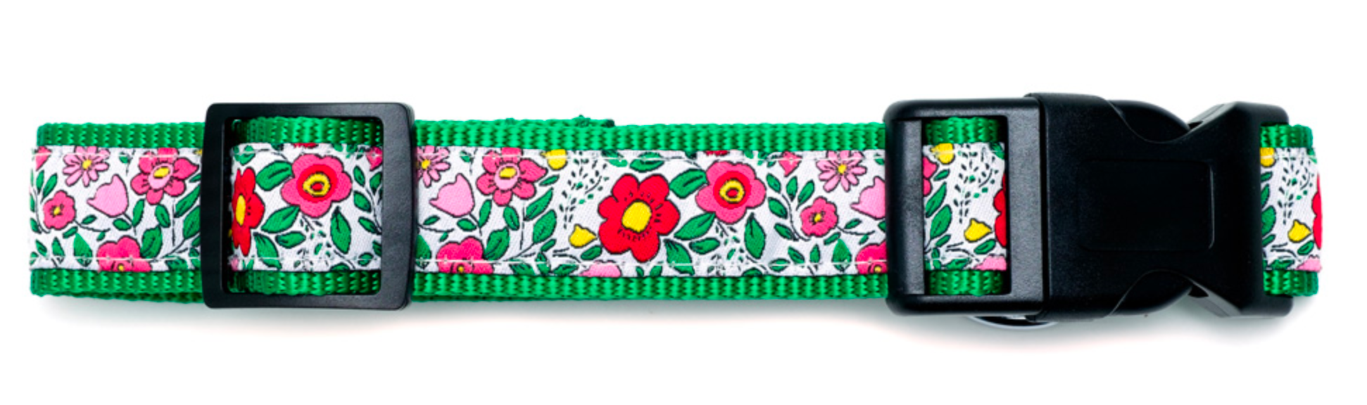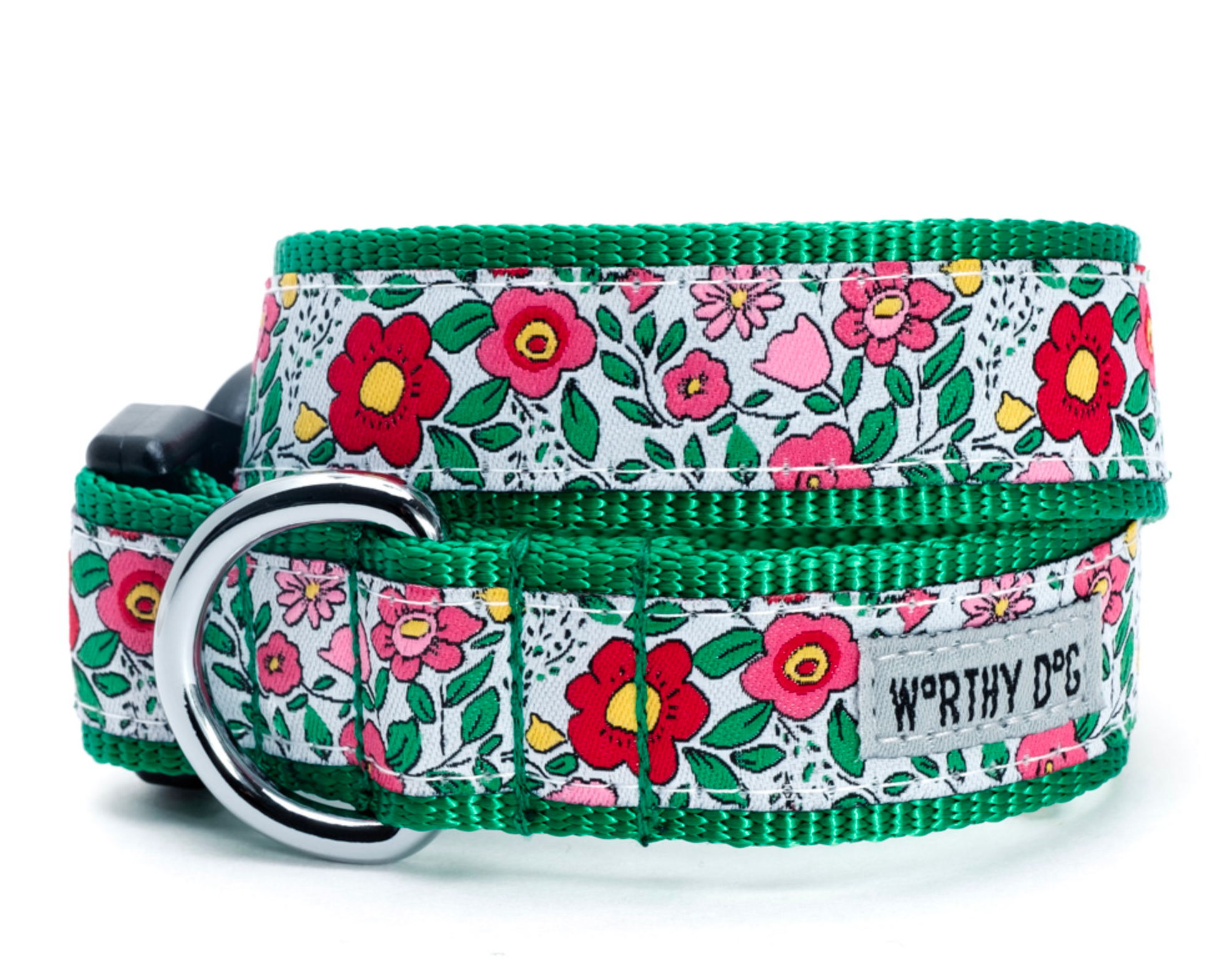 The Worthy Dog adjustable collar focuses on both durability and style, featuring woven ribbon sewn onto comfortable and durable nylon webbing with a snap clasp and nickel-plated D-ring