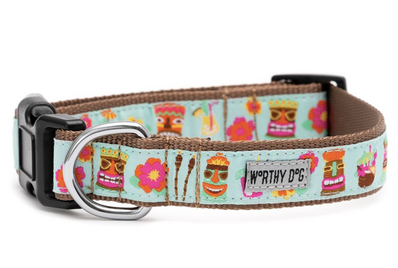 The Worthy Dog adjustable collar focuses on both durability and style, featuring woven ribbon sewn onto comfortable and durable nylon webbing with a snap clasp and nickel-plated D-ring